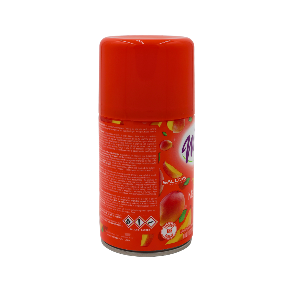 EL AEROSOL AMBIENTAL DE MANGO DE PRO CHEM IND. S.A. BRINDA UNA FRAGANCIA FRUTAL, DULCE Y ALEGRE QUE TRANSFORMA CUALQUIER ESPACIO EN SEGUNDOS. DISEÑADO PARA SER UTILIZADO CON DISPENSADORES AUTOMÁTICOS, LIBERA UNA ESENCIA INTENSA DE MANGO FRUTAL QUE AROMATIZA EFICAZMENTE OFICINAS, COMERCIOS Y HOGARES, OFRECIENDO UN AMBIENTE AGRADABLE Y ACOGEDOR.