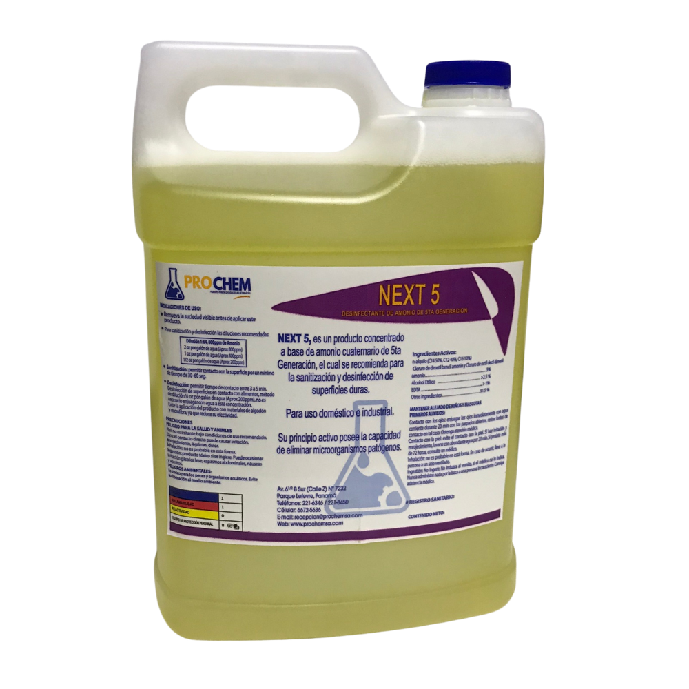 PRODUCTO CONCENTRADO FORMULADO A BASE DE AMONIO CUATERNARIO DE 5TA GENERACIÓN, DISEÑADO PARA LA SANITIZACIÓN Y DESINFECCIÓN EFICAZ DE SUPERFICIES DURAS. OFRECE AMPLIO ESPECTRO DE ACCIÓN CONTRA BACTERIAS, IDEAL PARA USO DOMÉSTICO Y EN INSTALACIONES INDUSTRIALES, GARANTIZANDO LIMPIEZA PROFUNDA, SEGURIDAD Y ALTO RENDIMIENTO CON UN BAJO NIVEL DE CORROSIÓN Y FÁCIL APLICACIÓN.