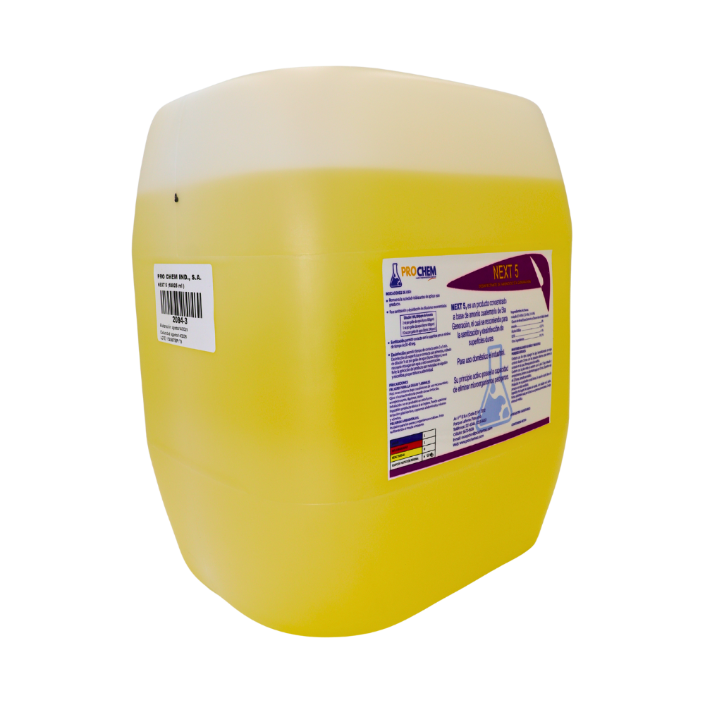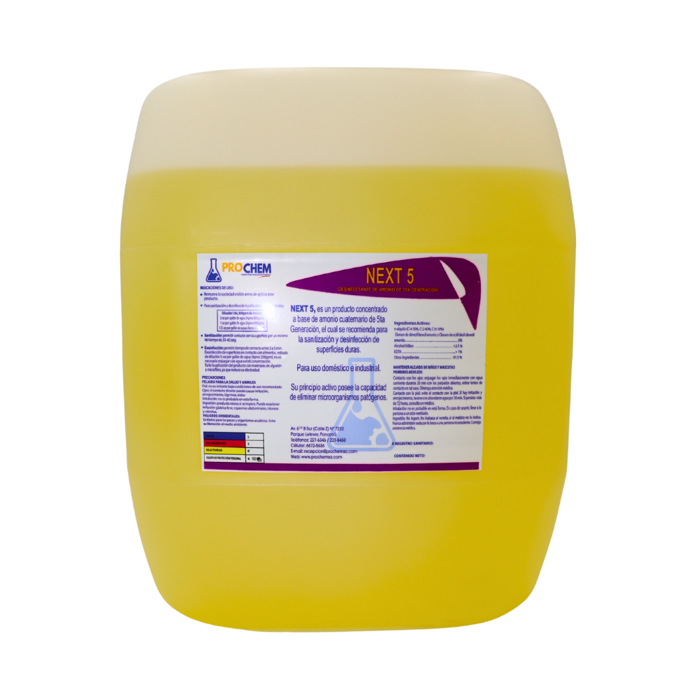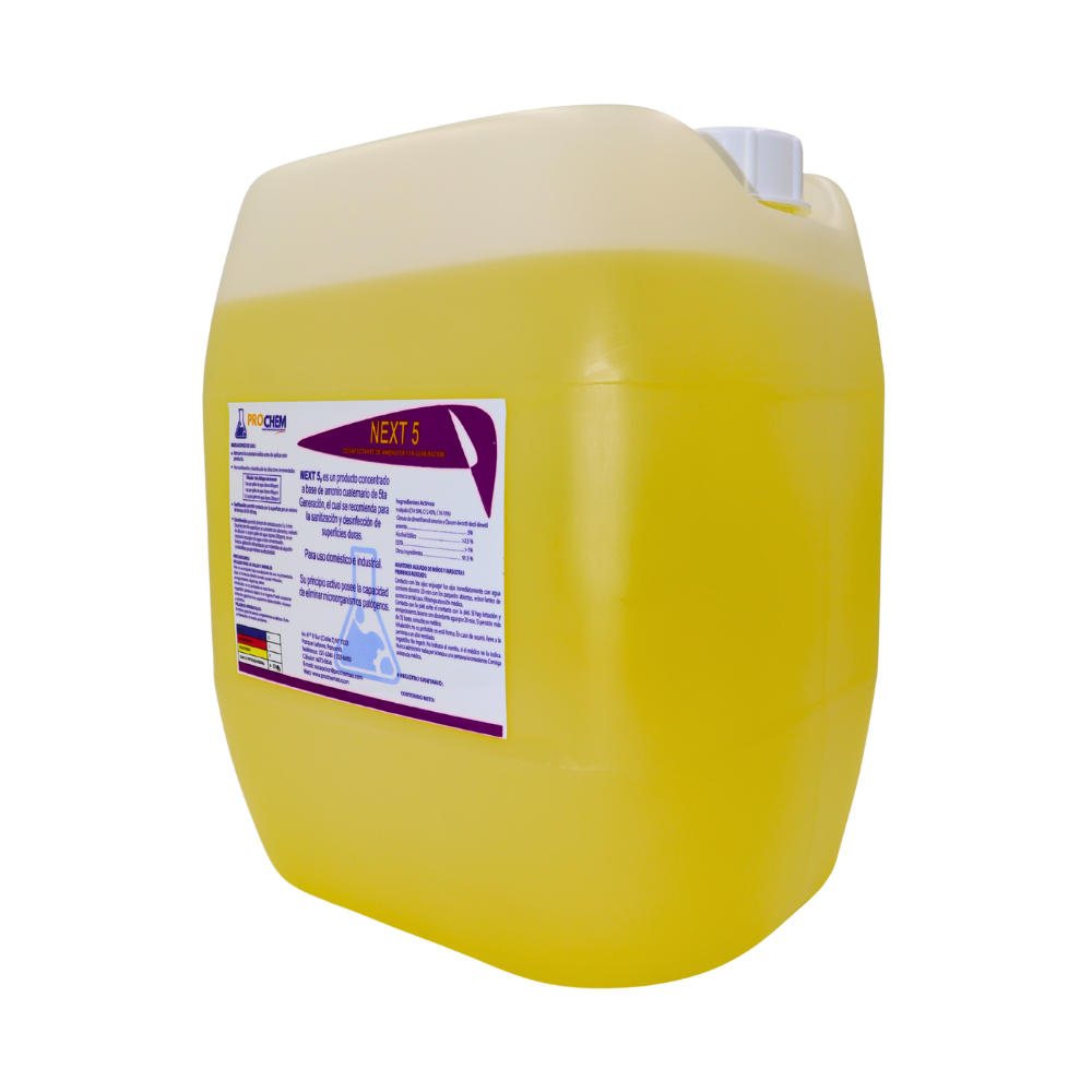 PRODUCTO CONCENTRADO FORMULADO A BASE DE AMONIO CUATERNARIO DE 5TA GENERACIÓN, DISEÑADO PARA LA SANITIZACIÓN Y DESINFECCIÓN EFICAZ DE SUPERFICIES DURAS. OFRECE AMPLIO ESPECTRO DE ACCIÓN CONTRA BACTERIAS, IDEAL PARA USO DOMÉSTICO Y EN INSTALACIONES INDUSTRIALES, GARANTIZANDO LIMPIEZA PROFUNDA, SEGURIDAD Y ALTO RENDIMIENTO CON UN BAJO NIVEL DE CORROSIÓN Y FÁCIL APLICACIÓN.